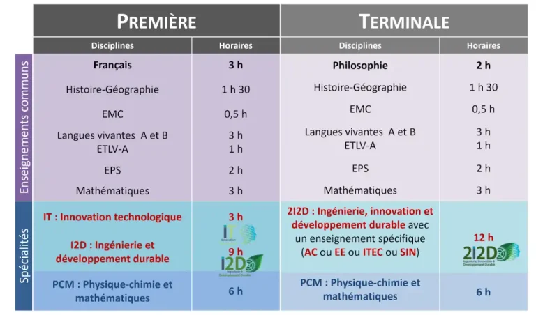 Mathématiques, Physique-Chimie, Français, Histoire-Géographie, Langues vivantes (LV1 & LV2), EPS, auxquels s’ajoutent des enseignements technologiques spécifiques.